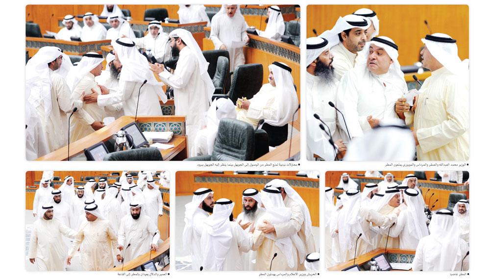 بعدها توجه النائب المطر الى المنصة مطالبا الرئيس السعدون بتطبيق اللائحة قائلا وهو في حالة انفعال «اما ان تطبق عليه اللائحة والا امد ايدي عليه.. هذا غير مؤدب سكران»، ورد السعدون «اهدأ سأطبق اللائحة» وعقب المطر: انا اسف لانفعالي طبق اللائحة عليه ثم رفع الرئيس الجلسة حتى يعود النظام الى القاعة.. وفي هذه الاثناء اخرج النائب حسين القلاف النائب الجويهل من القاعة وحاول بعض النواب منعه من الخروج.. وقال النائب علي الراشد انا اول من يصوت معكم فيما قال القلاف انا اخرج الجويهل حتى لا يتطور الأمر.