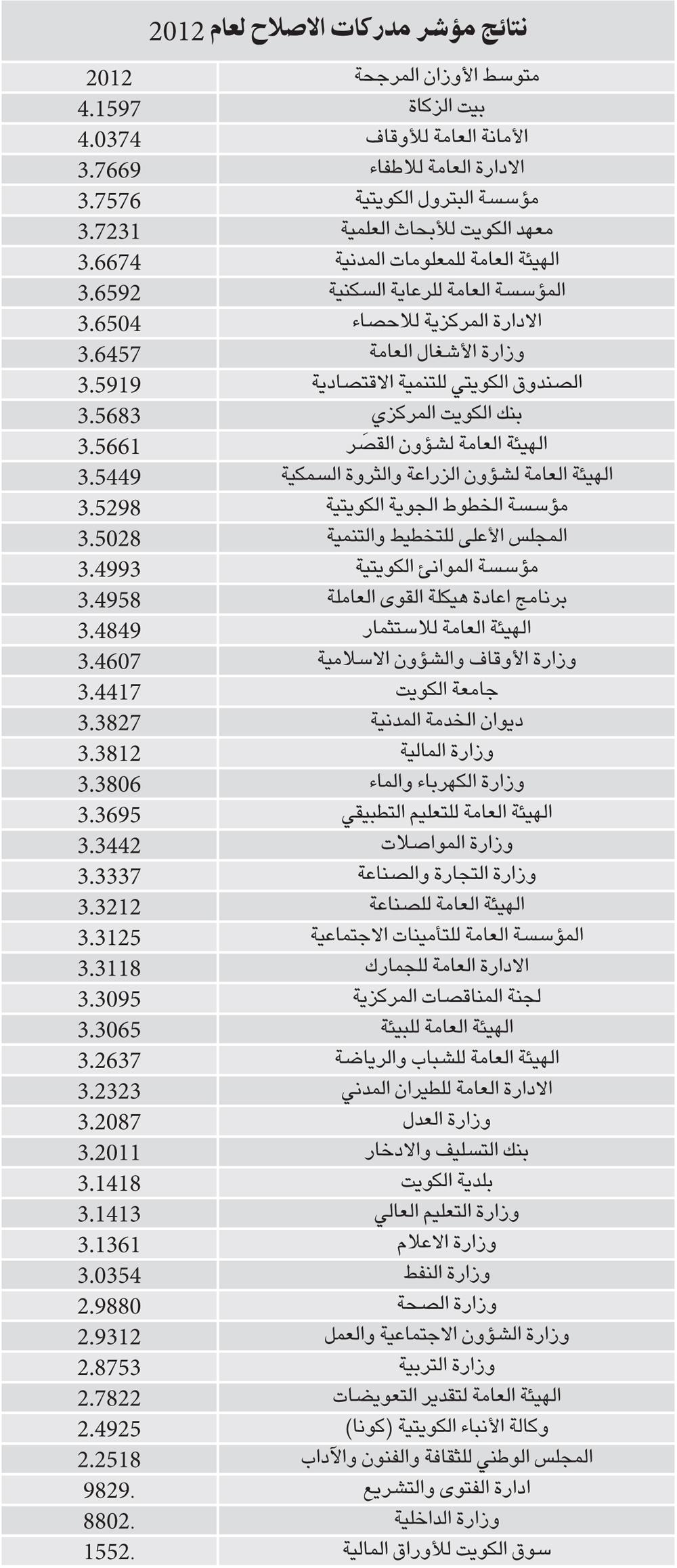 حل بيت الزكاة في المرتبة الأولى من بين 48 جهة حكومية في مؤشر مدركات الاصلاح في الجهات العامة في الدولة، بينما حلت الأمانة العامة للأوقاف في المرتبة الثانية، وجاءت الادارة العامة للاطفاء في المرتبة الثالثة، اما سوق الكويت للأوراق المالية فقد جاء في المرتبة الأخيرة.