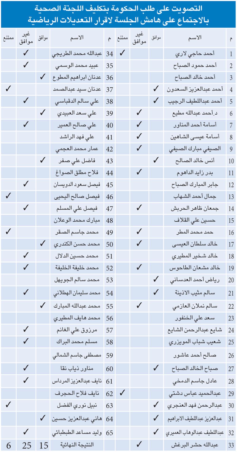 رفض مجلس الامة طلب الحكومة تكليف لجنة الشؤون الصحية والاجتماعية والعمل الاجتماع على هامش جلسة المجلس لدراسة التعديلات الحكومية على القوانين الرياضية واصدار تقريرها بهذا الشأن خلال ساعة تمهيدا لاقراره اليوم بمداولتيه الاولى والثانية، حيث رفضه 25 عضوا من اصل الحضور وعددهم 46 عضوا طلب الحكومة فيما وافق عليه 15 عضوا وامتنع ستة اعضاء عن التصويت.