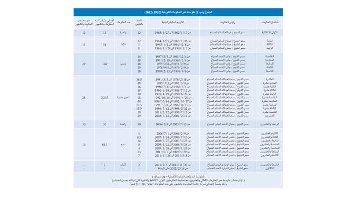 وفيما يلي نقدم رصداً لتسلسل الحكومات الكويتية وفترات استمراريتها وصولاً الى الحساب الدقيق لمتوسط أعمارها على مدى الفترة من يناير 1962 وحتى الوقت الحاضر (مايو 2012) (أنظر الجدول رقم (2).