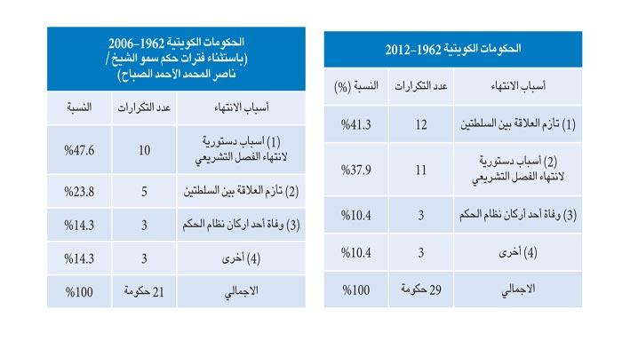(1) أنه خلال الفترة من 2006-1962 كانت الحكومات تنتهي لاسباب دستورية (بنسبة %48) او لأسباب تتعلق بتأزم العلاقة بين السلطتين (%24) أو لأسباب الوفاة أو أخرى بنسب متساوية (%14).