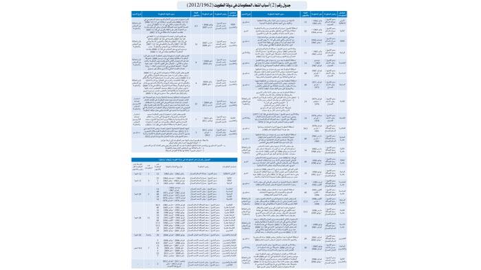 (1) بحساب متوسط عمر الحكومات في دولة الكويت (منذ يناير 1963وحتى فبراير 2012) فقد بلغت 21 شهراً للحكومة الواحدة في المتوسط.