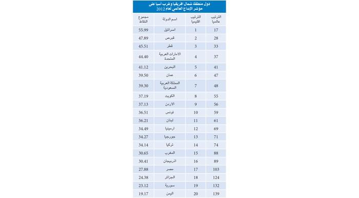 حلت الكويت في المركز 55 عالميا والثامن في منطقة شمال افريقيا وغرب آسيا على مؤشر معهد انسياد للمعرفة والادارة لعام 2012 الذي يعده بالتعاون مع المنظمة العالمية لحماية الملكية الفكرية، وهي احدى المنظمات التابعة للامم المتحدة، في حين حلت اسرائيل في المركز الاول اقليميا و17 عالميا، وتبعتها قبرص في الترتيب الثاني اقليميا و28 عالميا، ثم قطر في المركز الثالث اقليميا والثالث عربيا، في حين احتلت الامارات الترتيب 4 اقليميا و37 عالميا، ثم البحرين في المركز الخامس اقليميا و41 عالميا، وتبعتها عمان والمملكة العربية السعودية في المركزين السادس والسابع اقليميا و47 و48 عالميا على التوالي، في حين حلت سورية واليمن في المركزين الاخيرين 19 و20 اقليميا و132 و139 عالميا على التوالي.