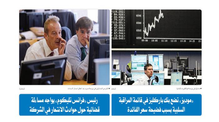 متداول في بورصة فرانكفورت بألمانيا (رويترز) - اثنان من المتداولين في بورصة مدريد بعد اعلان اصدار السندات (رويترز)
