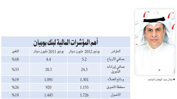 أعلن بنك بوبيان نتائجه المالية للنصف الأول من عام 2012 والتي أظهرت تحقيقه لصافي ربح قدره 5.2 ملايين دينار مقارنة مع 4.4 ملايين دينار عن نفس الفترة من العام الماضي وبنسبة نمو بلغت 18%، موضحاً ان هذه النتائج ناتجة عن أرباح البنك التشغيلية التي بلغت 15.5 مليون دينار.