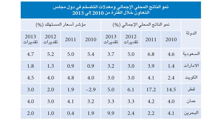 وفي السعودية يسجل الناتج المحلي الاجمالي %5 في 2012 ويتراجع الى %3.7 في 2013، في حين تسجل معدلات التضخم في السعودية، كبرى الاقتصادات في دول مجلس التعاون الخليجي اعلى مستوى للتضخم في المنطقة بواقع %5.2 في 2012 وان كانت ستتراجع بصورة طفيفة الى %4.7 في 2013.