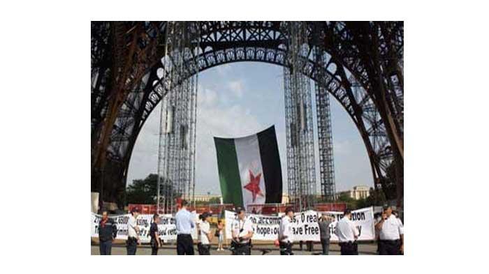 (ا ف ب) - وضع علم كبير للثورة السورية ظهر الجمعة على برج ايفل، ابرز المعالم السياحية في باريس "للفت نظر العالم الى الوضع في سوريا"، كما ذكر مراسل وكالة فرانس برس. فقد توجهت مجموعة صغيرة من ناشطي هيئة "فرنسا سوريا ديموقراطية" الى هذا البرج الذي تجرى فيه تصليحات.