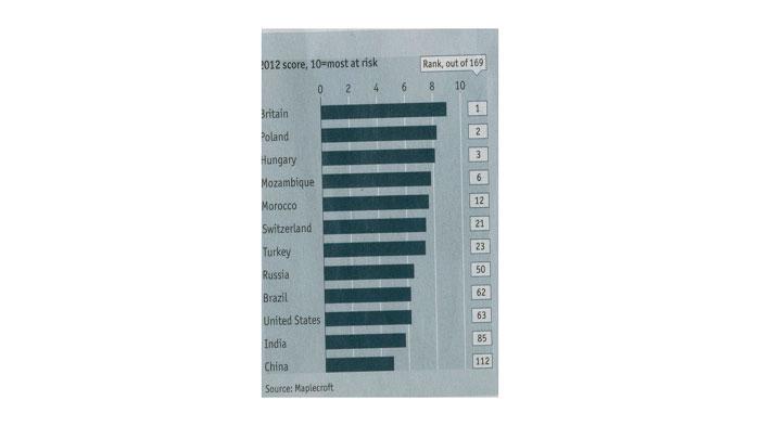 وقالت المجلة انه وفقا لما توصلت اليه مؤسسة ميبل كروفت المتخصصة في الابحاث الاقتصادية، فان بريطانيا تعتبر اكثر الدول الاوروبية تعرضا لتداعيات ازمة اليورو، وذلك نظرا لارتباطها الوثيق وعلاقاتها القوية مع دول القارة والتكامل الاقتصادي القائم بينها وبين هذه الدول باعتبارها اكبر الشركاء التجاريين لها.