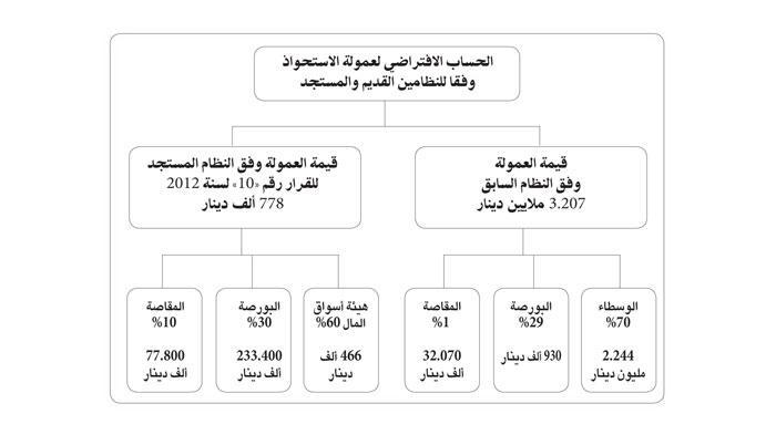 وبافتراض ان صفقات الاستحواذ الـ 16 تمت وفق قرار الهيئة رقم 10 فان توزيع رسوم الاستحواذ ستكون بقيمة 778 ألف دينار تتوزع بواقع %60 للهيئة «466 الف دينار» و%30 للبورصة «233.4 الفا دينار» و %10 للمقاصة «77.8 الف دينار».