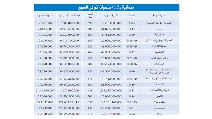 رسوم الاستحواذ الـ 16 وفق الآلية السابقة كانت تتوزع بواقع %70 للوسطاء «2.2 مليون دينار و%29 للبورصة» «930 ألف دينار» و %1 للوسطاء «32 ألف دينار».