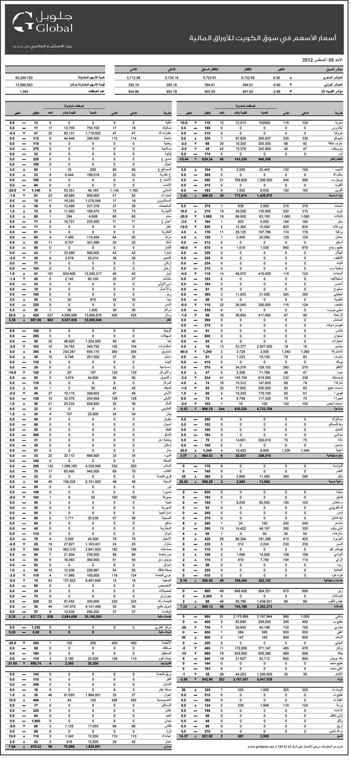 وضمت قائمة الأسهم الخمس الأكثر ارتفاعا كل من عيادة الكويت والمنتزهات وبوبيان دق ووياكو ووربة في الوقت الذي ضمت قائمة الأسهم الخمس الأكثر انخفاضاً كلا من البحرية ومجموعة الأوراق وفلكس والتعمير والأنظمة.