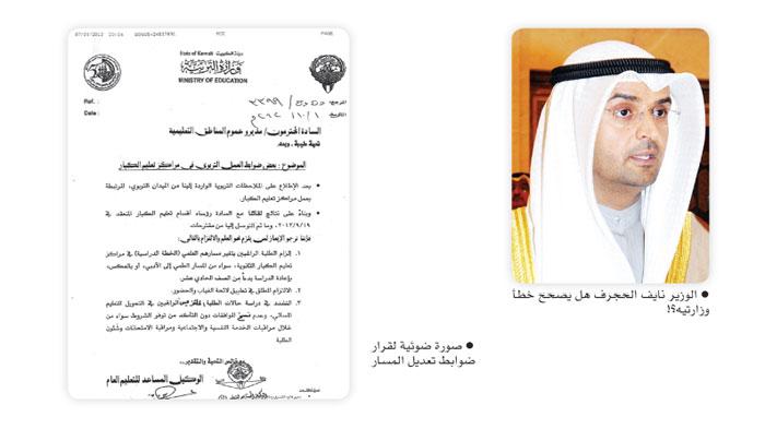 يأتي هذا الرفض من هذا المسؤول التربوي على الرغم من ان وكيل الوزارة للتعليم العام اصدر يوم الاحد الماضي قرارا بعد مراجعة هذا الطالب له يحدد ضوابط قبول اعادة تعديل المسار التعليمي وكلها منطبقة على هذا الطالب الذي اثر ان يضحي بسنتين من عمره ليعيد بدء حياته الدراسية من جديد بسبب خطأ قبوله في المعهد ذي التخصص العلمي وهو خريج ثانوية فرع ادبي ومع هذا لا يجد قبولا ولا مساعدة لمعالجة الخطا الحكومي بامتياز فهل يصحح هذا الوضع وزير التربية وزير التعليم العالي د.نايف الحجرف؟.. بالذات وان اليوم هو اليوم الاخير لتسجيل طلبة المسائي.