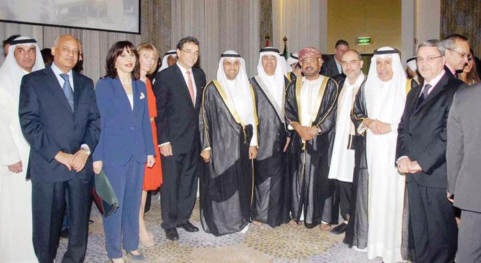 الوزير د.نايف الحجرف ود.ابراهيم الدعيج والسفير الاسباني اثناء قطع قالب حلوى الاحتفال