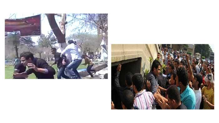 وبمجرد وصول المسيرة الى الجامعة تحول الحرم الجامعي الى حرب شوارع بين المتظاهرين من جهة وطلاب أسرة «نيوفجين» بكلية الحقوق وعدد من البلطجية الذين استعان بهم بعض الطلاب من الخارج للاستقواء بهم.. وقام المتظاهرون بمطاردة طلاب «نيوفجن» بالحجارة والزجاجات الفارغة وذلك على خلفية المشاجرة الاخيرة التي وقعت بين الأسرة وبين طلاب الاداب حيث قام طلاب اسرة الحقوق بتحطيم مقر الجوالة بكلية الاداب مما ادى الى وقوع عشرات المصابين داخل الجامعة.