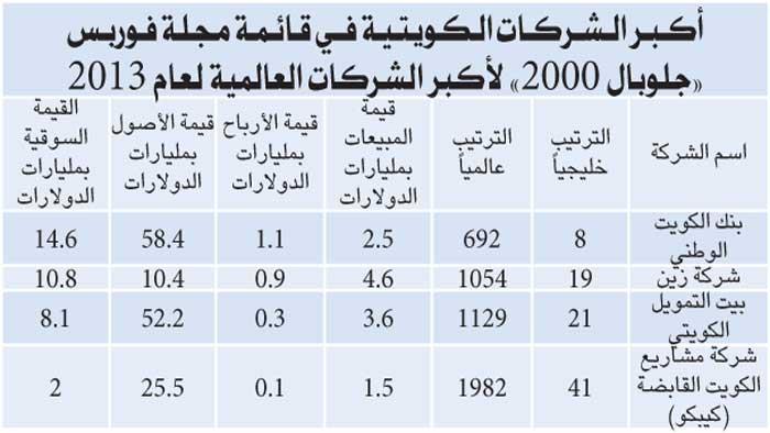 حلت اربع شركات كويتية في قائمة مجلة فوربس «جلوبال 2000» لاكبر الشركات العالمية العامة في 2013 من حيث قيمة المبيعات والارباح والاصول والقيمة السوقية وفقا للبيانات المالية في 2012 وهي بنك الكويت الوطني وشركة زين وبيت التمويل الكويتي وشركة مشاريع الكويت القابضة (كيبكو).