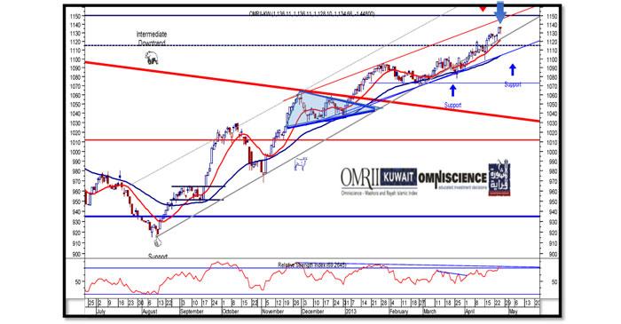 وعلى الصعيد الفني فقد أنهى مؤشر أومنيشنز المشورة والراية للأسهم الاسلامية الكويت الاسبوع الماضي تداولاته عند 1134.66 نقطة بارتفاع بلغ مقداره %0.64 عن اغلاقه السابق. هذا ومازالت حركة التدوير المفتعل في اقفالات الشركات وخاصة غير النشكة منها تدفع المؤشر الى اعلى الى مستوى مقاومته المستهدف سابقا عند 1150 نقطة وهو ما يمكن ان نشهده خلال الأسبوع الحالي الا اننا لا يجب ان نغفل اشارة البيع على مؤشر القوة النسبية (RSI) وهو ما يأتي بالتزامن مع اقتراب المؤشر من خط القناة الصاعد متوسط الأجل وايضا شكل (Hanging Man) وهو من الاشكال اليابانية العاكسة للاتجاه الصاعد «التي تحتاج الى تأكيد» كل ذلك قد يدفع بالمؤشر لأسفل في حركة تصحيحية لأسفل قبل الوصول الى مستواه المستهدف لذلك وجب الحذر الشديد في متابعة أداء المؤشر.