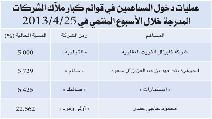 وأيضاً ضمن عمليات دخول مساهمين في قوائم كبار ملاّك الشركات المدرجة في سوق الكويت للأوراق المالية خلال الأسبوع المذكور، دخلت «استثمارات» قائمة كبار ملاّك «صافتك» بنسبة %6.425، وأيضاً تم اعلان شركة كابيتال الكويت العقارية من ضمن كبار ملاّك» التجارية «%5.000، كما دخلت الأميرة الجوهرة بنت فهد بن عبدالعزيز آل سعود قائمة كبار ملاّك «سنام» بنسبة %5.729 من رأس مالها، علماً بأن «سنام» موقوفة عن التداول اعتباراً من 2013/4/21 نظراً لكون موعد الجمعية العمومية للمساهمين - والذي تم تحديده بتاريخ 2013/5/6 - قد تجاوز 45 يوماً من تاريخ اعتماد نتائجها للعام 2012.