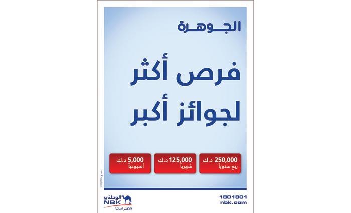 وقد قام البنك الوطني بتطوير حساب الجوهرة وتعزيز قيمة الجوائز ليقدم لعملائه فرصا أكثر للفوز بما يكرس ريادته في السوق المصرفية المحلية، حيث زاد من فرص عملائه للفوز بـ 5 آلاف دينار أسبوعياً و125 ألف دينار شهرياً و250 ألف دينار ربع سنوياً، وذلك انطلاقاً من سعيه الدائم الى مكافأتهم وتقديم الأفضل لهم.