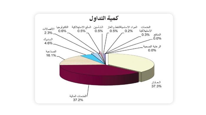 كما تقدم قطاع شركات الخدمات المالية الى المرتبة الثانية للتداول 152.9 مليون دينار بنسبة %35.2 من اجمالي قيمة الأسهم المتداولة وذلك من خلال تداول 2.106.1 مليون سهم بنسبة %37.2 موزعة على 31.098 صفقة بنسبة %37.9.