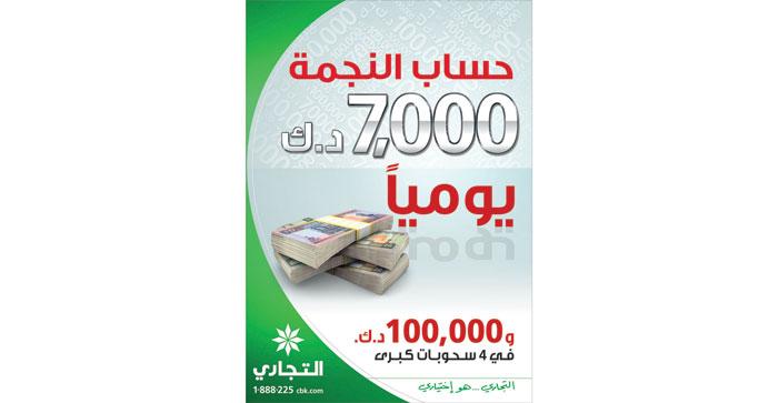 ويتميز حساب النجمة الجديد بتأهيل عملائه الفوز بجائزة يومية قدرها -/7000 دينار، لينفرد البنك التجاري بتقديم اكبر جائزة سحب يومي، بالاضافة الى أربعة سحوبات كبرى تجرى خلال العام تبلغ قيمة كل جائزة منها 100.000 دينار تقام في العيد الوطني والتحرير، عيد الفطر، وعيد الأضحى المبارك بالاضافة الى ذكرى تأسيس البنك في 19 يونيو.