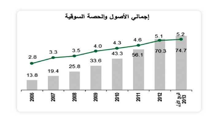 وبالمقارنة مع البنوك التقليدية، نجد نمو اجمالي أصول البنوك التقليدية بنسبة %4.2 خلال الربع الأول من 2013 (2012: %11.4 على أساس سنوي) لتصل الى 1.3 تريليون ليرة من مبلغ الـ 1.25 تريليون ليرة المسجل في نهاية 2012 فيما تظهر قاعدة بيانات البنك المركزي ان معدل نمو الأصول في بنوك المشاركة يتفوق باستمرار على نظيره في البنوك التقليدية.