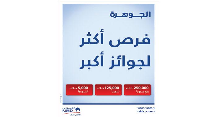 وقد قام البنك الوطني بتطوير حساب الجوهرة وتعزيز قيمة الجوائز ليقدم لعملائه فرصا أكثر للفوز بما يكرس ريادته في السوق المصرفية المحلية، حيث زاد من فرص عملائه للفوز بـ5.000 دينار أسبوعياً و125 ألفاً شهرياً و250 ألف دينار ربع سنوية.