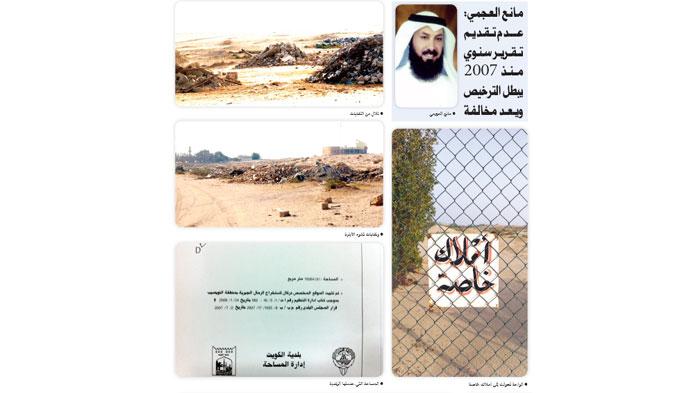 وفي هذا الصدد اكد عضو المجلس البلدي مانع العجمي انه سوف يقوم بتقديم سؤال الى البلدية عن الارض المسورة في منطقة النويصيب متسائلا هل التزمت الشركة المستفيدة بالشروط التي اقرها المجلس البلدي واهمها تقديم مردود بيئي وايداع مبلغ مالي مجزي كتأمين لافتا الى ان عدم تقديم تقرير سنوي منذ عام 2007 بحد ذاته يعد مخالفة ويبطل الترخيص الذي اقرة المجلس!!