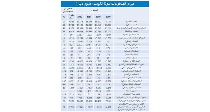 وبالنظر الى وضع ميزان المدفوعات بالمفهوم الواسع، فقد ارتفع الفائض الى مستوى غير مسبوق بلغ 20.7 مليار دينار في العام 2012. وهذا الميزان العام لا يأخذ فقط في الاعتبار التغيرات في الاحتياطات التي يملكها بنك الكويت المركزي، بل أيضاً التغيرات في قيمة الموجودات الخارجية للجهات الحكومية الرئيسية، وأبرزها الهيئة العامة للاستثمار ومؤسسة البترول الكويتية وشركة الخطوط الجوية الكويتية.