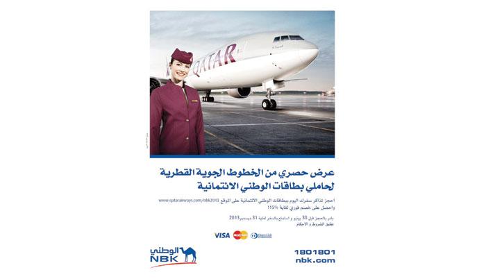 يقدم بنك الكويت الوطني بالتعاون مع الخطوط الجوية القطرية خصومات فورية تصل الى %15 لحاملي بطاقات الوطني الائتمانية على جميع رحلات الخطوط القطرية، وذلك لغاية 30 يونيو الجاري.