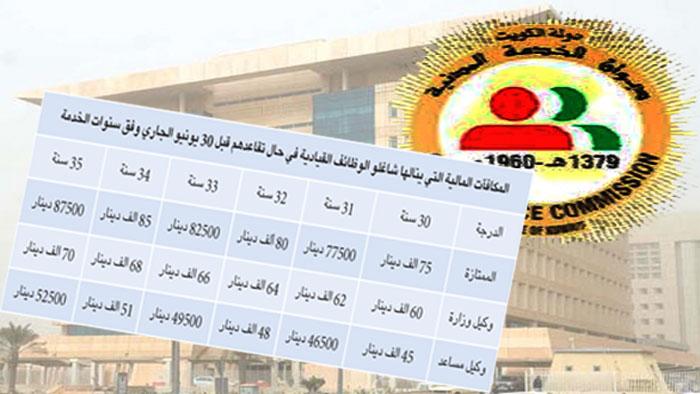 وقال ديوان الخدمة في تعميمه الصادر امس الى الجهات الحكومية انه تنفيذا لقرار مجلس الوزراء رقم (681) الصادر بتاريخ 2013/5/13 بمنح شاغلي الوظائف القيادية ومن في حكمهم الموجودون في الخدمة حاليا بمكافأة استحقاق بواقع نصف مرتب شهري عن كل سنة من سنوات الخدمة الفعلية المسجلة لدى المؤسسة العامة للتأمينات الاجتماعية وبحد اقصى (35) سنة ويتم اتخاذ المرتب المقرر بقرار مجلس الخدمة المدنية رقم (2012/49) اساسا لاحتساب هذه المكافأة بواقع (5000) دينار شهريا للدرجة الممتازة و(4000) دينار شهريا لدرجة وكيل وزارة و(3000) دينار شهريا لدرجة وكيل وزارة مساعد، وذلك في حالة انتهاء خدمتهم بالاستقالة في موعد اقصاه 2013/6/30.