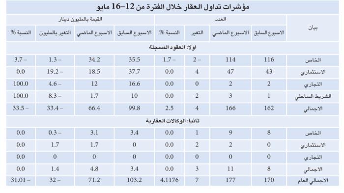 رغم ان حركة التداولات العقارية شهدت ارتفاعاً في أعداد العقارات المتداولة خلال الفترة من 12 الى 16 مايو، حيث ارتفع المؤشر من 170 الى 177 عقارا وبنسبة ارتفاع بلغت %4.1، الا ان القيمة الاجمالية للعقارات المتداولة خلال تلك الفترة قد انخفضت بشكل كبير، حيث انخفضت القيمة من 103.2 الى 71.2 مليون دينار بانخفاض بواقع 32 مليون دينار وبنسبة %31.