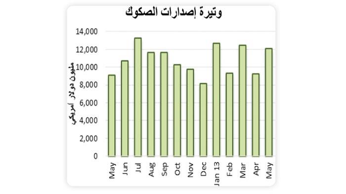 وسجلت الصكوك في السعودية 2.1 مليار دولار بحصة سوقية بنسبة %17.5 من اجمالي الاصدارات خلال مايو. وبلغ اجمالي اصدارات السعودية في عام 2013 مبلغ 7.1 مليارات دولار، بينما سجلت الاصدارات من الامارات اجمالي مبلغ 5.2 مليارات دولار. وكان هناك اصداران للشركات من تركيا خلال الشهر باجمالي مبلغ 700 مليون دولار أو %5.8 من اجمالي الاصدارات.