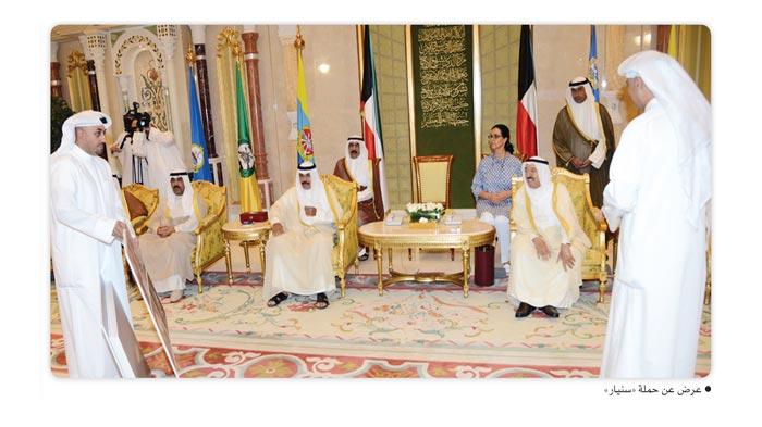 من جهة أخرى، تفضل سموه صباح امس وبحضور سمو ولي العهد الشيخ نواف الاحمد الجابر الصباح بتدشين الحملة الوطنية للحفاظ على البيئة البحرية (سنيار 7) وذلك بقصر بيان.