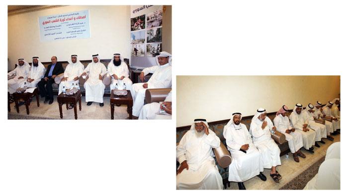 طالب المشاركون في ندوة «أصدقاء وأعداء ثورة الشعب السوري» التي أقيمت أمس الاول بنصرة الثورة السورية ودعم المجاهدين ماليا، محذرين مما تقوم به إيران وحزب الله تجاه الشعب السوري، مشددين على انه لا يمكن التعويل على دور جامعة الدول العربية التي اعتبروها فشلت ويجب اعلان وفاتها، مؤكدين على ان الامم تكالبت على الشام ولكل أطماعه ومخططاته والكل يريد ان يقتل حلم هذا الشعب، معتبرين ان ما يحدث في سورية هو «هولوكوست» جديد يقتل فيه الشعب السوري حتى وصل عدد الشهداء لأكثر من 100 الف قتيل فيما دمرت المدن وبلغ عدد النساء المغتصبات قرابة 15 الف امرأة.