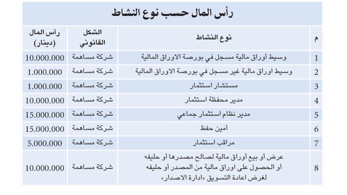 أصدرت هيئة اسواق المال قرارا رقم (32) لسنة 2013 لمجلس مفوضي هيئة اسوق المال بشأن متطلبات رأس مال الاشخاص المرخص لهم حدد في مادته الاولى الحد الادنى لرأس المال المدفوع للاشخاص المرخص لهم بعدد 8 انشطة وسجلت تلك الانشطة تحديد رأسمال بنحو 10 ملايين دينار لوسيط الاوراق المالية المسجل في البورصة ومليون دينار لكل من مستشار الاستثمار ووسيط الاوراق المالية غير المسجل في البورصة و10 ملايين دينار لمدير محفظة الاستثمار و15 مليونا لكل من مدير نظام الاستثمار الجماعي وأمين الحفظ و5 ملايين دينار لمراقب الاستثمار.