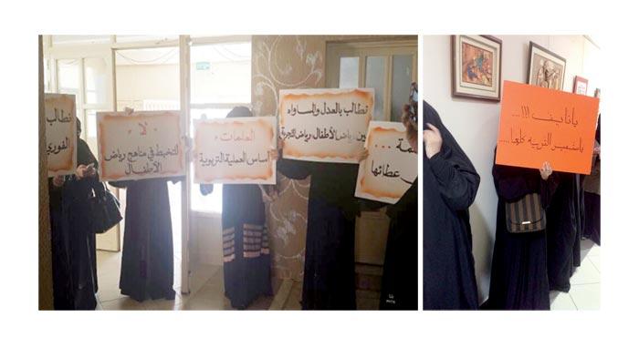 في تظاهرة تنبئ بفشل تجربة رياض المناهج للاطفال اعتصمت معلمات رياض اطفال طبقت تجربة المناهج في منطقة الجهراء التعليمية يشكين ما يتعرضن له من ضغط تسبب له التطبيق الحالي للتجربة دون توفير عناصر مهمة لانجاح هذه التجربة ما جعلهن يقلن بفشلها.