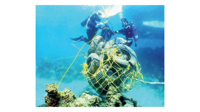 جانب من جهود فريق الغوص لرفع مخلفات شعاب قاروه