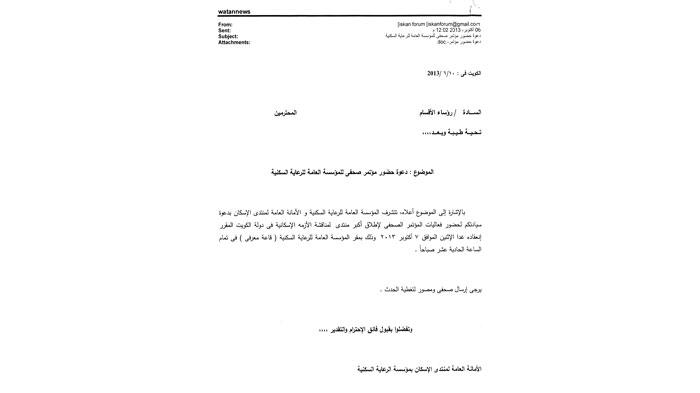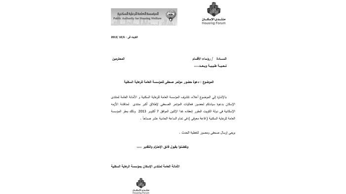 وكانت وسائل اعلام من صحف وقنوات تلفزيونية بادرت للحضور الى مؤسسة الرعاية السكنية امس اهتماما بهذا المنتدى الذي كان يزمع الاعلان في المؤتمر عن اطلاقه كون القضية الاسكانية من اهم القضايا التي تشغل المواطن الكويتي.