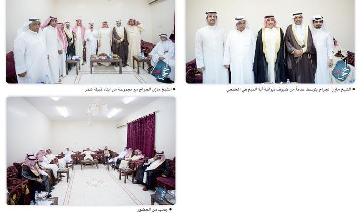 اقام الشيخ عودة عبيد أبا الميخ وهو أحد اعيان قبيلة شمر على شرف مدير عام الإدارة العامة للجنسية ووثائق السفر، العميد الشيخ مازن الجراح الصباح، حفل عشاء في محافظة الخفجي في السعودية، بحضور عدد من وجهاء المحافظة وأعيانها وأهلها الكرام، وتبادلوا فيما بينهم الأحاديث الودية والعلاقة الاخوية الوطيدة بين السعوديين والكويتيين.