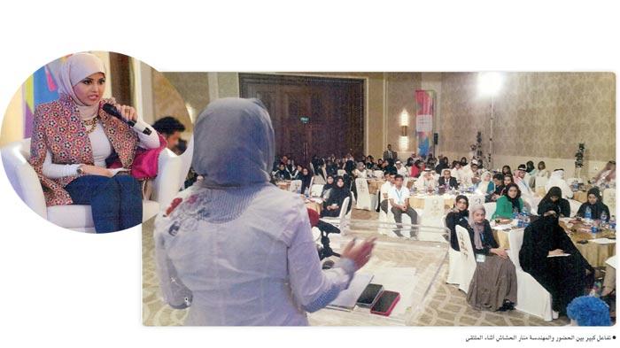 شاركت المهندسة الكويتية منار الحشاش كمتحدثة رئيسية في الملتقى الشبابي «المرأة ووسائل الاتصال الاجتماعي»، احدى الفعاليات المصاحبة ليوم المرأة البحرينية، التي امتدت أعماله يومي 8 و9 أكتوبر الجاري.