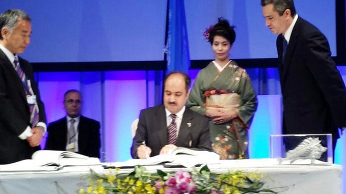 سفير دولة الكويت لدى اليابان عبدالرحمن العتيبي خلال توقيعه «اتفاقية ميناماتا»