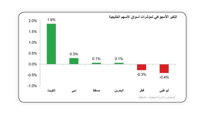 وبالنسبة للسوق الكويتي قال التقرير: في الوقت الذي تعرض فيه المؤشر السعري للسوق لضغوط اثر تراجع اسعار أسهم مضاربية، تقدمت بعض الأسهم القيادية لتشكل دعماً لهذا المؤشر مانحة اياه نوعاً من الثبات.فبعد الخسائر التي مني بها في الأسبوع السابق، استطاع المؤشر تغيير مساره من الهبوط الى الصعود اذ شهد مكاسب متتالية خلال جلسات الاسبوع الى ان بلغت نسبتها مع نهايته %1.9 مستقراً عند مستوى 7.766.83 نقطة.