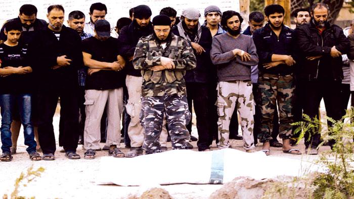 عناصر من الجيش الحر يصلون على أحد أفرادهم الذي سقط في دير الزور (رويترز)