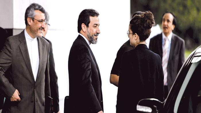 عباس عراقجي (يسار) رئيس الوفد التفاوضي الايراني اثناء مغادرته مقر اقامته لإجراء يوم ثان من التفاوض مع القوى الكبرى في جنيف (ا و ب)