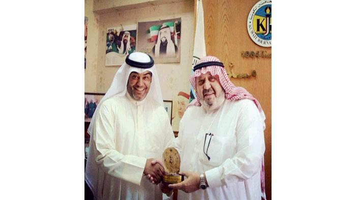 قدم سيف أبو العدل رئيس الاتحاد العربي والاتحاد الكويتي للجمباز درعا تذكارية لفيصل القناعي رئيس الاتحاد الآسيوي للصحافة الرياضية تقديرا لدوره في دعم البطولة العربية الخامسة للجمباز على كأس الشهيد فهد الأحمد الصباح التي استضافتها الكويت أخيراً.