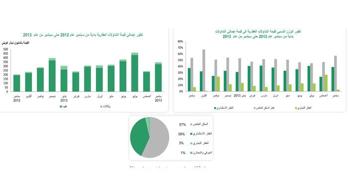 وقد تضمنت قيمة التداولات العقارية الاجمالية لشهر سبتمبر %57 للسكن الخاص حيث ارتفعت مساهمتها في شهر سبتمبر، بينما جاءت العقارات الاستثمارية في المرتبة الثانية بنحو %39، وتراجعت مساهمة تداولات العقارات التجارية بشكل ملحوظ لتسهم بحصة قدرها نحو %3 من اجمالي قيمة التداولات في سبتمبر، بينما ساهمت تداولات العقارات الحرفية والمخازن بنحو %1 من اجمالي قيمة التداولات العقارية ولم تسجل عقارات الشريط الساحلي أي نشاط.