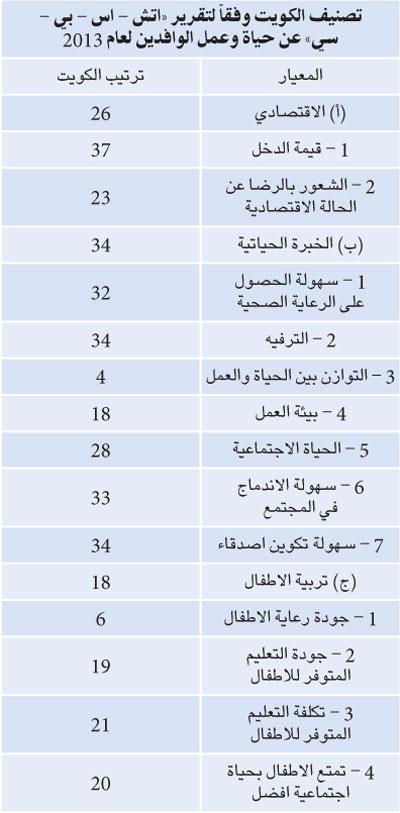 اما المعيار الثالث وهو تربية الاطفال فقد حلت الكويت في المركز الـ18 بالنسبة للوافدين، والمركز السادس في جودة رعاية الاطفال، والمركز 19 في جودة التعليم المتوفر للاطفال، والمركز 21 في تكلفة التعليم المتوفر للاطفال، والمركز 15 في سهولة الحصول على تعليم افضل.
