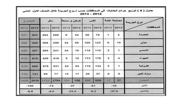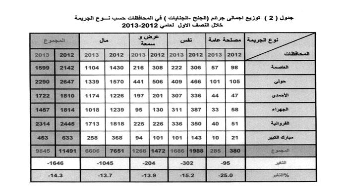 وقال انه مع ملاحظة التحليل الاحصائي، فان الجرائم خلال هذه الفترة لعام 2013 جاءت منخفضة في كافة المحافظات بالمقارنة مع عام 2012، وكانت اعلى المحافظات ارتكابا لجرائم الجنح والجنايات هي محافظة الفروانية وبلغت (2314) جريمة عام 2013 بالمقارنة بعام 2012 وبلغت (2445) جريمة، تليها في المرتبة الثانية محافظة حولي حيث بلغت (2290) جريمة عام 2013 بالمقارنة بعام 2012 وبلغت (2647) جريمة فيما جاءت محافظة الاحمدي بالمرتبة الثالثة حيث بلغت الجرائم (1722) في عام 2013 جريمة مقارنة مع نفس الفترة من عام 2012 حيث بلغت الجرائم (1810).