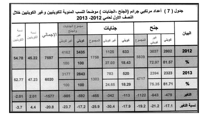 كما يلاحظ من التحليل الاحصائي انخفاض اعداد اجمالي مرتكبي الجنح من الكويتيين وغير الكويتيين حيث بلغت (4717) مرتكبا خلال الفترة من 1/1 حتى 30/6 من عام 2013 مقارنة مع نفس الفترة من عام 2012 وقد بلغت (5839) بانخفاض عددي وقدره (1122) مرتكبا اي بنسبة تغير %19.22.