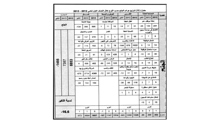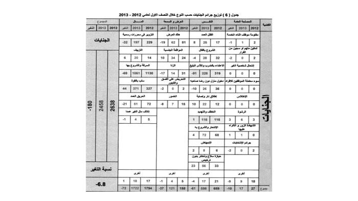 وفيما يلي المؤشرات الاحصائية للجرائم للشهور الستة الاولى للعام 2013 بالمقارنة بنفس الفترة من عام 2012.